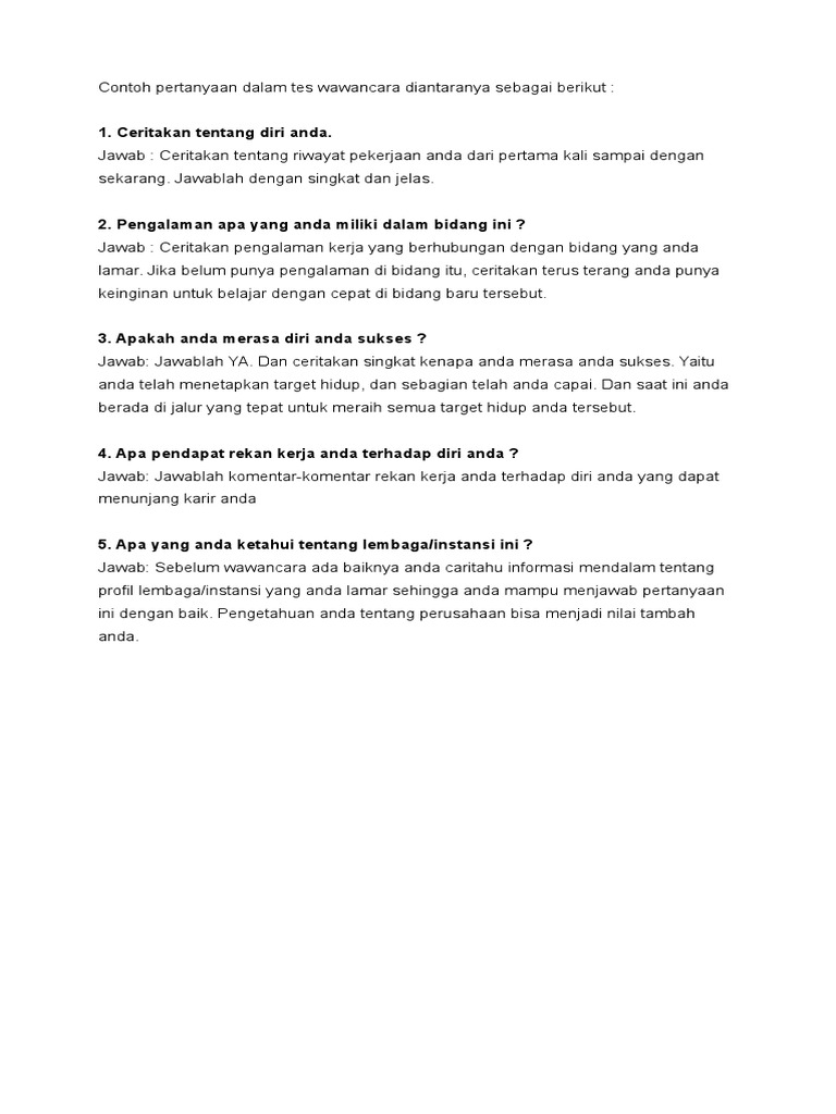 Kunci untuk menjawabnya dengan baik adalah membuat jawaban yang ringkas tetapi informatif. Ceritakan tentang diri anda sering menjadi kalimat pembuka saat kita melakukan wawancara kerja. Itu adalah pertanyaan sederhana yang sering dipakai untuk membuka sebuah wawancara kerja. Contoh jawaban untuk kandidat berpengalaman. Posted on november 23, 2012.